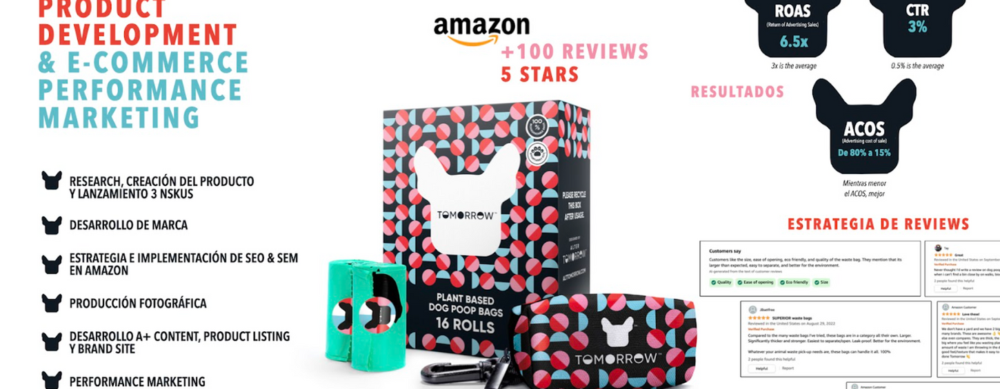 La estrategia incluyó desarrollo de marca, selección de materiales eco-amigables, producción fotográfica, y creación de contenido optimizado para SEO y SEM en Amazon. Además, se implementó una estrategia integral de performance marketing y manejo de reviews. Este enfoque llevó a Tomorrow a obtener más de 100 reseñas de 5 estrellas en Amazon, con un ROAS 6.5x superior al promedio y un CTR de 3%, destacando el éxito de la campaña y su impacto en el mercado.