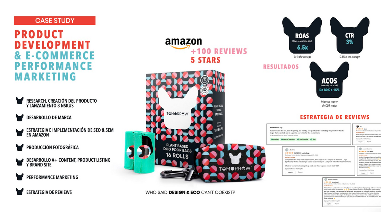 La estrategia incluyó desarrollo de marca, selección de materiales eco-amigables, producción fotográfica, y creación de contenido optimizado para SEO y SEM en Amazon. Además, se implementó una estrategia integral de performance marketing y manejo de reviews. Este enfoque llevó a Tomorrow a obtener más de 100 reseñas de 5 estrellas en Amazon, con un ROAS 6.5x superior al promedio y un CTR de 3%, destacando el éxito de la campaña y su impacto en el mercado.